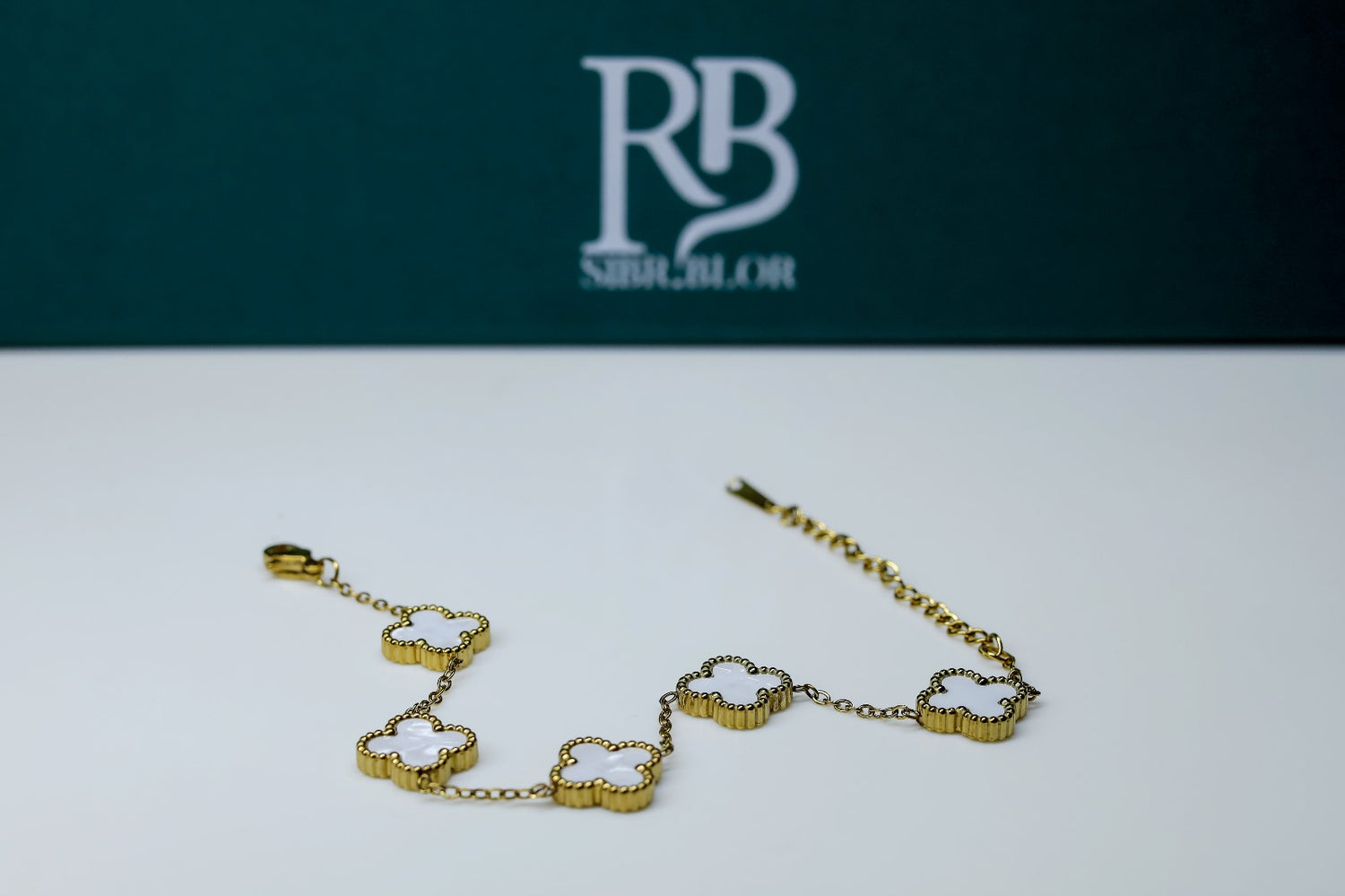 Dieses filigrane Armband in edlem Gold mit weißen Kleeblatt-Elementen schenkt dir Leichtigkeit, Stil und ein Gefühl von Besonderheit.
