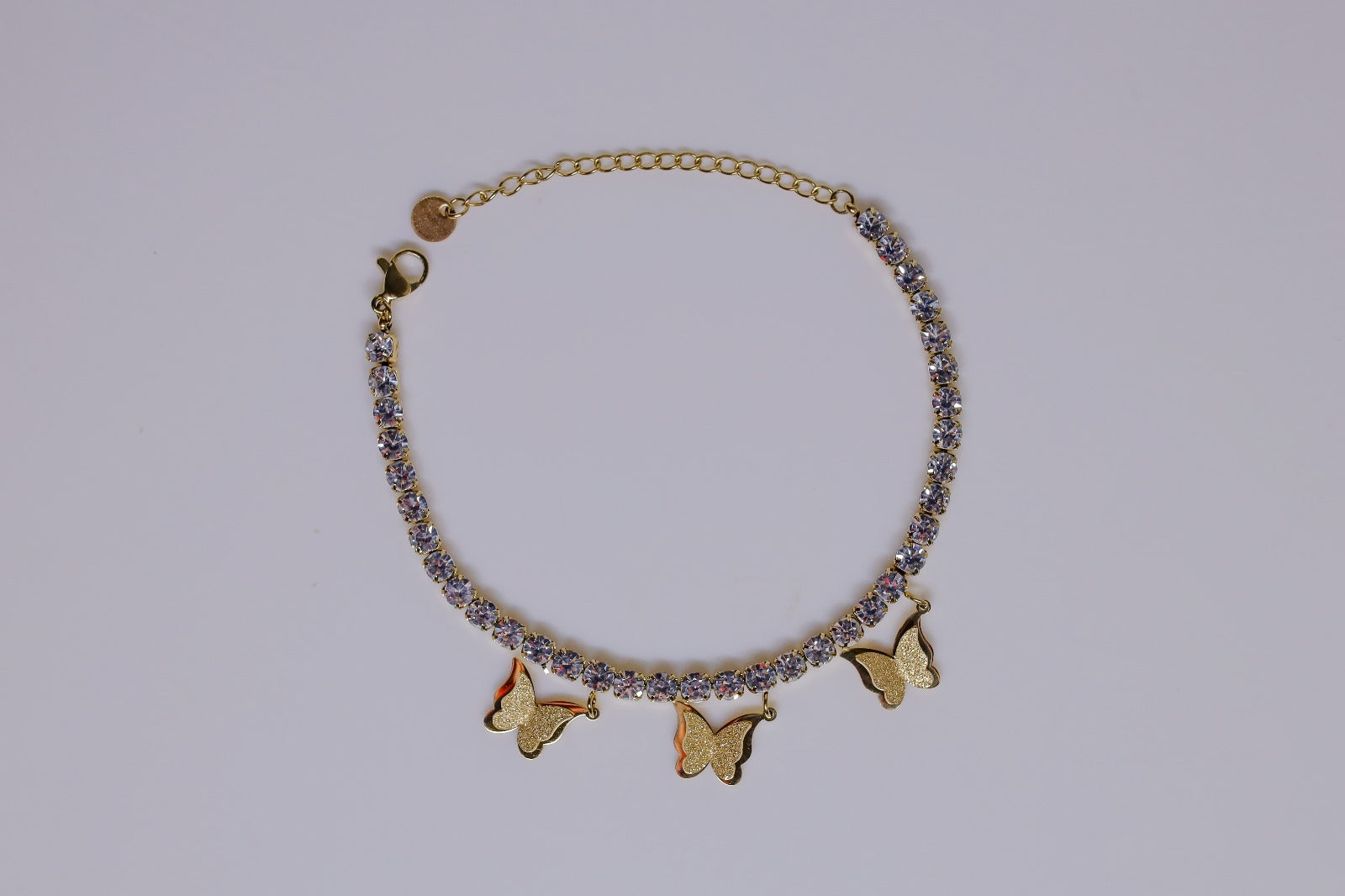 • Funkelnde Kristallkette mit drei goldenen Schmetterlings-Anhängern